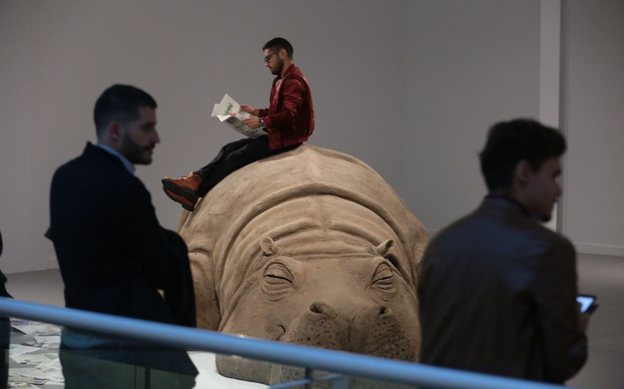Durante la inauguración, de pronto un hombre se subió al lomo del animal y, con parsimonia, se puso a leer el periódico. Aunque el hipopótamo no es el asiento más cómodo, el lector ni se inmutaba. De pronto hizo sonar un silbato, que parecía una llamada de atención, pero siguió con su lectura. Era un performance. En días subsecuentes, los visitantes están invitados a mencionar en sus propias palabras lo que implica la corrupción, aunque no a subirse a la llamativa instalación.