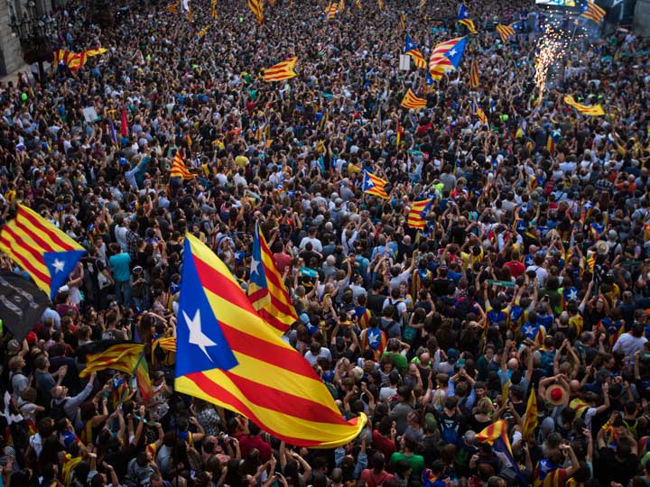Catalanes jubilosos ocupan la plaza central de Barcelona, dispuestos a festejar la creación de su nueva república tras la votación en el parlamento.