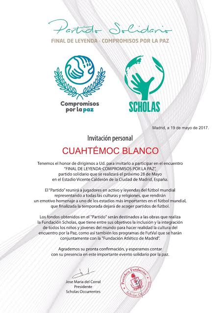 La Fundación Scholas convocó a los mejores jugadores en activo y leyendas del fútbol que se enfrentarán al Atlético de Madrid en el partido denominado «Final de leyenda, compromiso por La Paz», según lo informado esta tarde por el área de comunicación social del presidente municipal Cuauhtémoc Blanco Bravo.