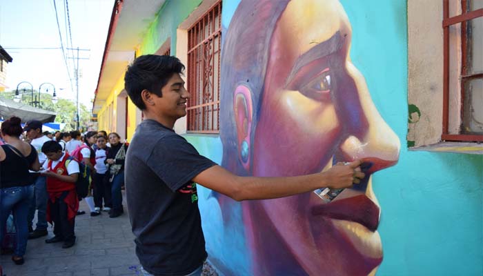Su autor, Bryan Molina, de 17 años, comentó que con esta obra en la fachada de la primaria “Justo Sierra”, ubicada a un costado de la alcaldía, se buscó mejorar el entorno urbano, pero también rescatar los símbolos que identifican a este histórico lugar habitado desde la época prehispánica.