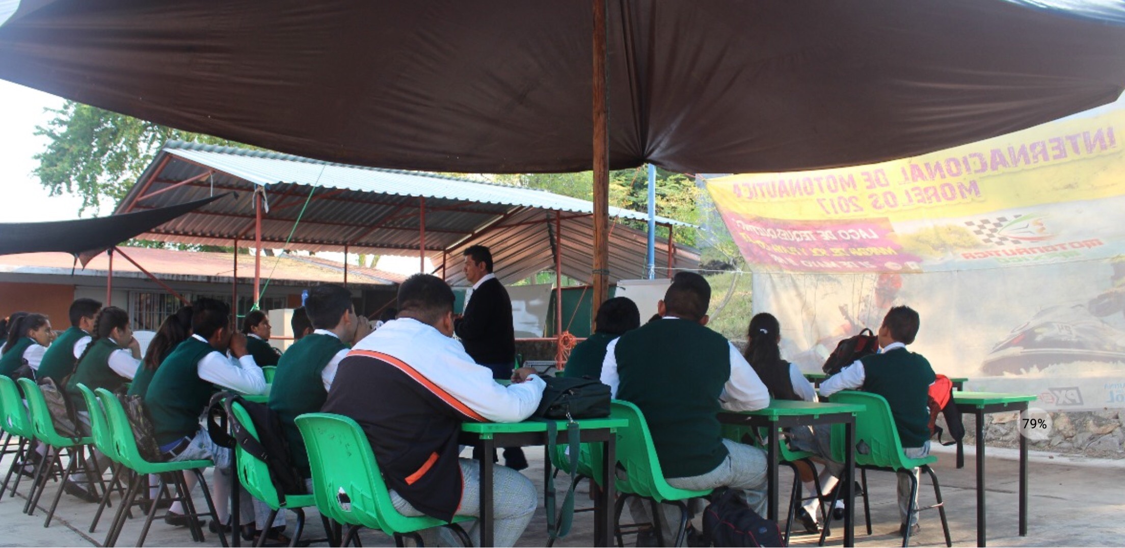 Una de las escuelas afectadas fue la Telesecundaria “Niños Héroes”, en Tequesquitengo, en donde tres salones sufrieron daños, por lo que los maestros dan sus clases bajo lonas.