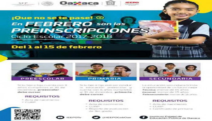 Oaxaca de Juárez, Oaxaca, México: 31 de enero de 2017.- A partir de mañana miércoles uno al 15 de febrero, se llevará a cabo en todo el estado de Oaxaca el proceso de preinscripción para el próximo año escolar 2017-2018, con el fin de que las niñas, niños y jóvenes a ingresar a primero de preescolar, primaria y secundaria, tengan un lugar asegurado en los planteles educativos de la entidad.