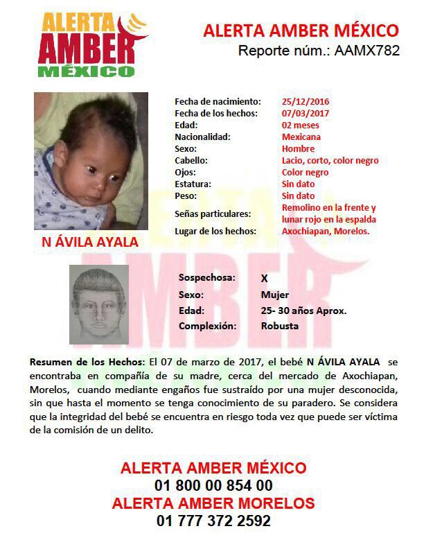 En el reporte se indica que el bebé de nombre «N» Ávila Ayala se encontraba en compañía de su madre cuando mediante engaños fue sustraído por una mujer de complexión robusta.