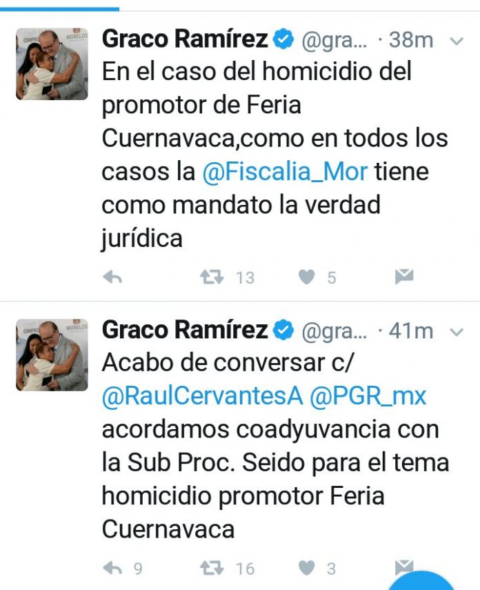 Morelos (WDC).- El gobernador del estado de Morelos, Graco Ramírez acordó con el procurador general de la República, Raúl Cervantes Andrade la coadyuvancia entre la Fiscalía General del Estado de Morelos y la Subprocuraduría Especializada en Investigación de Delincuencia Organizada (SEIDO) para investigar los hechos en los que perdió la vida el concesionario de la Feria Cuernavaca 2017, Juan Manuel García Bejarano durante una cabalgata que se llevó a cabo en la avenida Plan de Ayala el 6 de abril.