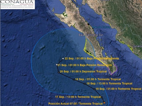 CIUDAD DE MÉXICO (Excelsior).- El Servicio Meteorológico Nacional (SMN) pronosticó que este domingo la tormenta tropical Norma se localizará al suroeste de Baja California Sur, manteniendo desprendimientos nubosos hacia el noroeste y occidente del país.