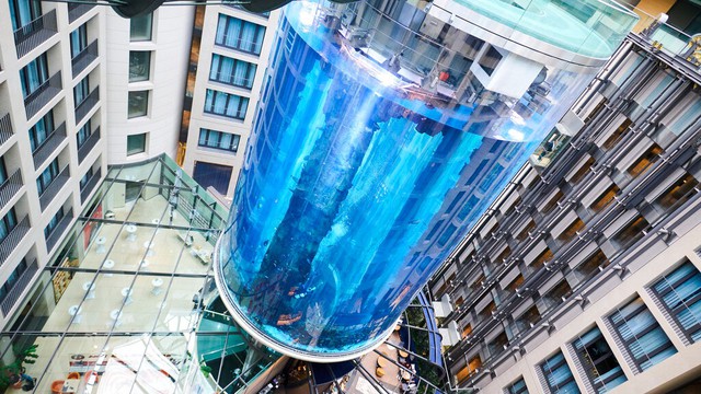 El Aquadom, era el acuario privado más grande del mundo, el cual era un cilindro de 16 metros de alto por 11.5 metros de diámetro y su altura total es de 25 metros.