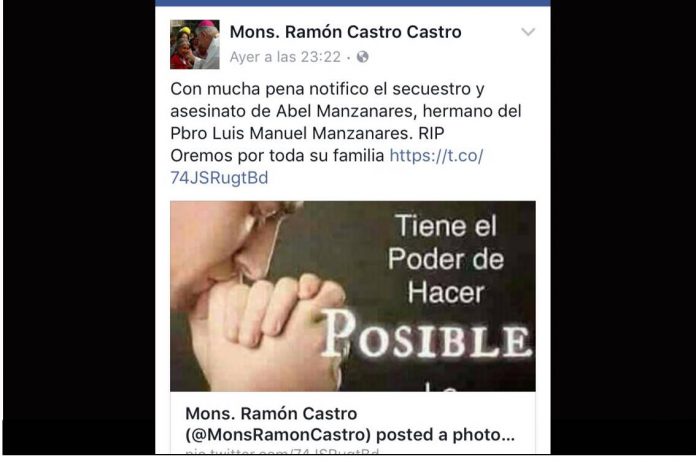 «Con mucha pena notifico el secuestro y asesinato de Abel Manzanare hermano del Pbro. Luis Manuel Manzanares. RIP oremos por toda su familia».