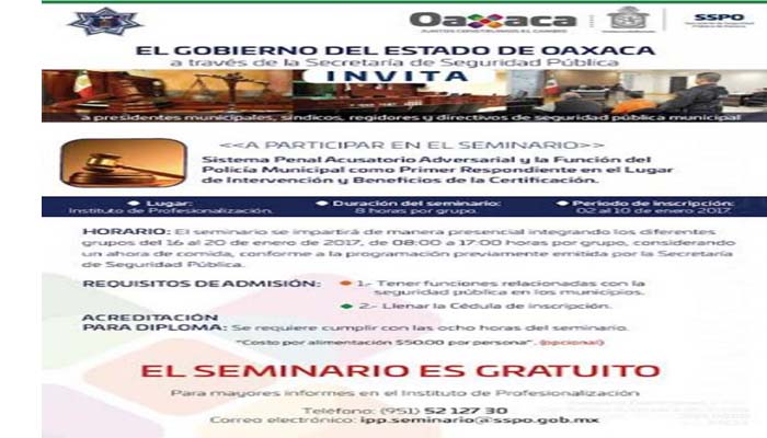 Cabe mencionar que el seminario se impartirá de manera presencial integrando los diferentes grupos del 16 al 20 de enero de 2017, de 08:00 a 17:00 horas por grupo, considerando una hora de comida, conforme a la programación previamente emitida por la Secretaría de Seguridad Pública de Oaxaca y será requisito indispensable cumplir con las ocho horas destinadas para obtener la acreditación.