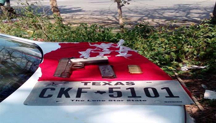 Asimismo, en el interior del vehículo de la marca Mazda, tipo Mazda 3, modelo 2013, color blanco, con número de serie JM1BL1VFXD1831444, los oficiales de la BOM-CACALUTLA localizaron una pistola tipo escuadra calibre 45mm, con matricula 345714 y un cargador abastecido con 7 cartuchos útiles; 12 bolsas de plástico con polvo blanco con características propias de la cocaína, y una placa de circulación de vehículo con la matrícula CKF-5101 del estado de Texas, USA.