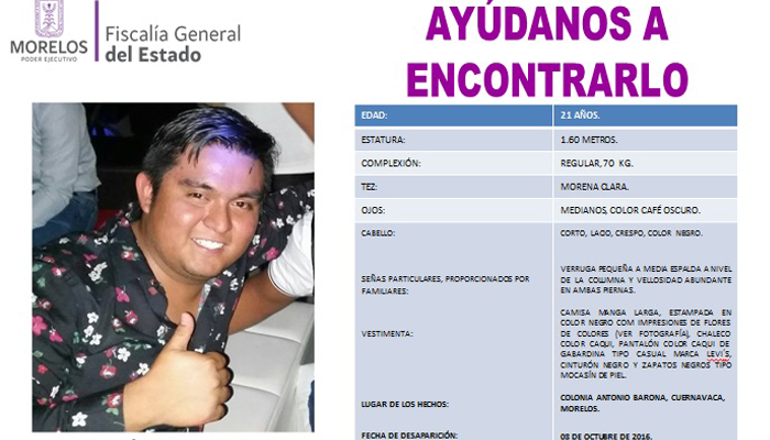 CUERNAVACA, MORELOS, 11 DE OCTUBRE DEL 2016 (WdC).- El hijo de una juez de lo familiar del Tribunal Superior de Justicia de Morelos desapareció desde el día sábado en la colonia Antonio Barona del municipio de Cuernavaca, por lo que es buscado por sus familiares a través de una cédula de localización difundida por la Fiscalía General del Estado desde la noche de este lunes.