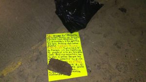 En los tres hallazgos se encontraron cartulinas con un mensaje que decía «Tito recojo tu Basura no seas Puto y pelea con nosotros no te escondas y te agarres del huevo del comandante SERGIO TELLEZ BARCENAS Sabemos q’ lo tienes en tu nomina Te protege y te da los pitasos. Pero con nosotros se la van a pelar porque les vamos a partir su madre. El CJNG va a hacer limpia de ti y toda tu pura gente y ya empezamos sabes de que te estamos hablando perro» (sic).