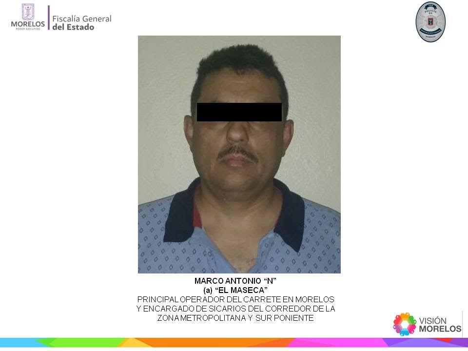 Cuernavaca, Morelos.- El fiscal General del Estado, Javier Pérez Durón dio a conocer que el sábado 14 de enero fue detenido Marco Antonio “N”, alías “El Maseca” principal operador de Santiago Mazari, alías “El Carrete” líder de la célula criminal de Los Rojos que opera en la región sur-poniente y norte del estado Morelos.