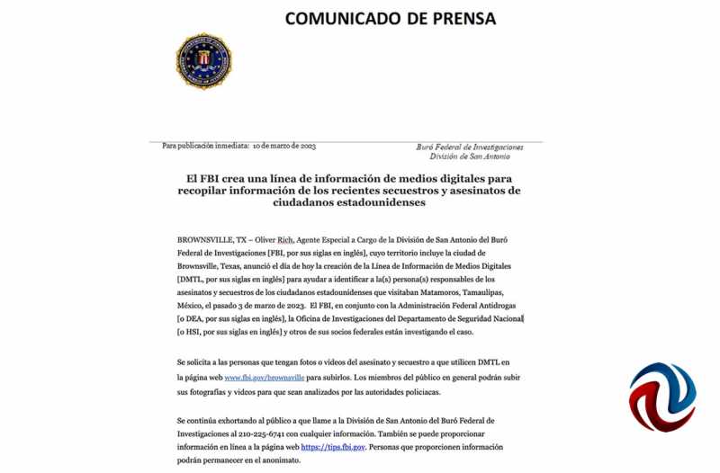 TIJUANA BC 11 DE MARZO DE 2023 (AFN).- La Embajada de Estados Unidos en México dio a conocer que el Buró Federal de Investigaciones (FBI por sus siglas en inglés) abrió una línea de información por medios digitales, para recopilar información que permita identificar a los responsables del secuestro de cuatro ciudadanos norteamericanos, y la ejecución de dos de ellos, ocurrida en Matamoros, Tamaulipas.