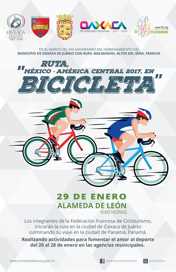 La actividad deportiva se enmarca en el 22 Aniversario del hermanamiento entre el municipio capitalino de Oaxaca de Juárez y Rueil Malmaison, Francia. Contará con la participación de más de 40 ciclistas de la Federación Francesa de Cicloturismo (FFC) originarios del país galo, Suiza y Canadá, quienes durante tres meses recorrerán más de 2 mil 800 kilómetros en bicicleta hasta llegar a la capital de este país de América Central.