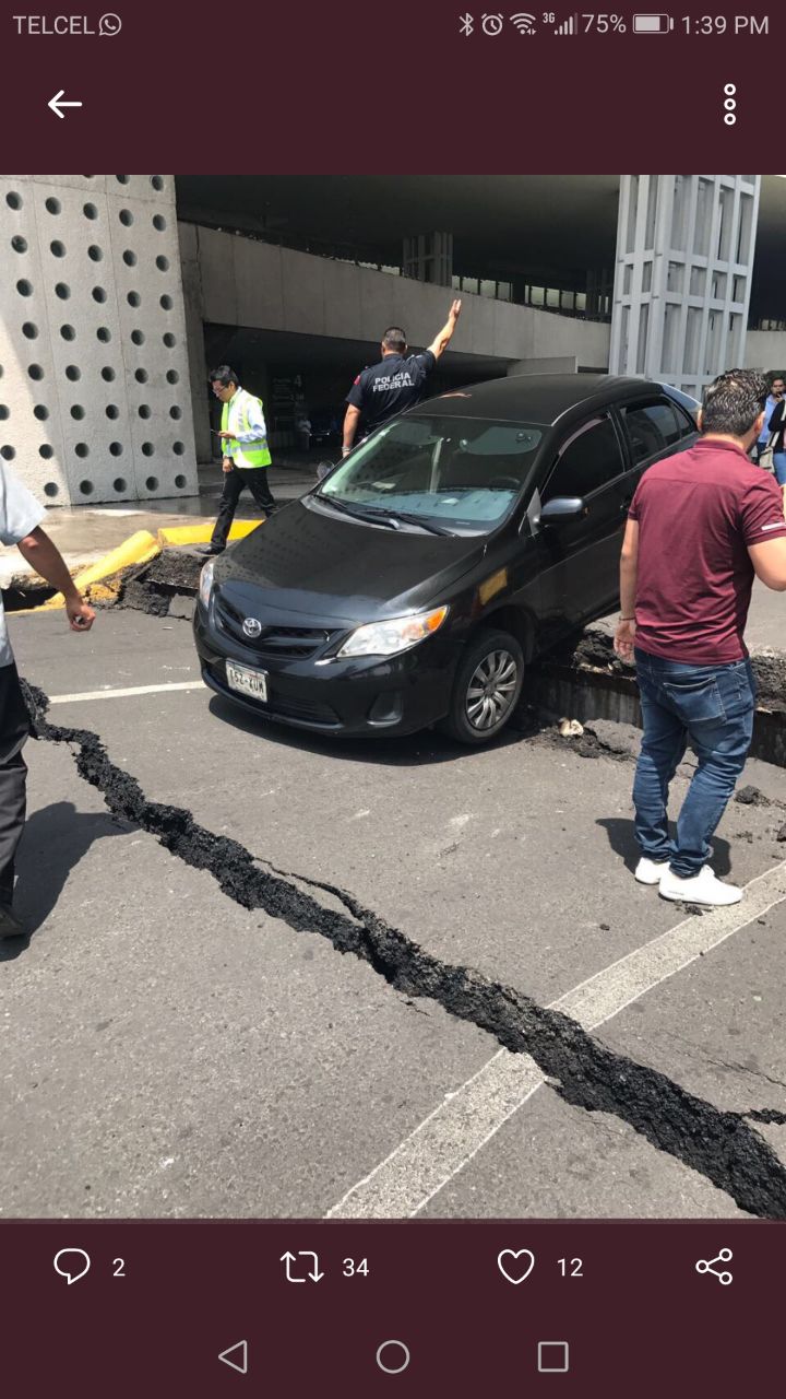 • Terminal 2 del Aeropuerto Internacional de la Ciudad de México (AICM), reporta daños en plafones, vidrios, mampostería. Destaca falla severa en suelo en áreas de vialidades, así como un socavón en la Glorieta de la Vialidad de la Terminal 2, cercanía con la avenida Hangares.