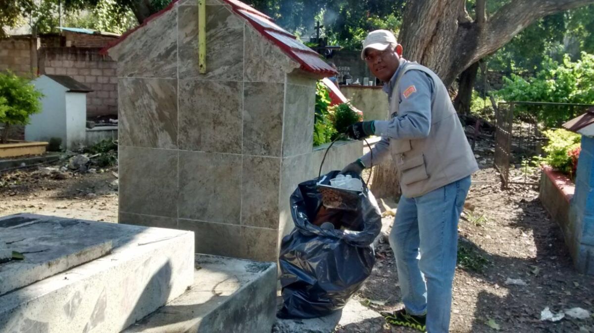 Informó que en coordinación con las autoridades municipales se están realizando acciones de barrido, desyerbado, lavado y tallado de depósitos; así como volteado y tapado de recipientes que puedan acumular agua en los 133 panteones del estado.