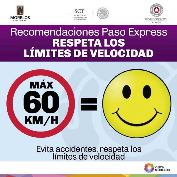 Cuernavaca, Morelos.- Ante la apertura de los diez carriles que integran el Paso Express, la Coordinación Estatal de Protección Civil Morelos (CEPCM) reiteró el llamado a los automovilistas para que manejen con precaución y respeten los límites de velocidad.
