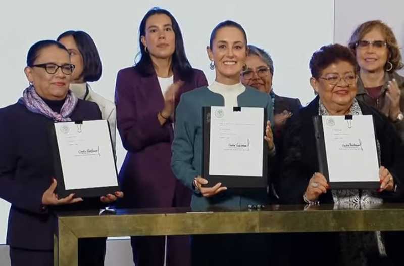 CIUDAD DE MÉXICO CDMX 3 DE OCTUBRE DE 2024 (AFN).- La presidenta Claudia Sheinbaum Pardo firmó esta día, en un espacio de su conferencia matutina en Palacio Nacional, una serie de iniciativas de reformas constitucionales que ofrecerán más derechos y protección a las mujeres; además de informar detalles de la entrega gradual de pensiones a mujeres de 60 a 64 años, con la meta de abarcar a las mexicanas de forma universal hasta el año 2026.