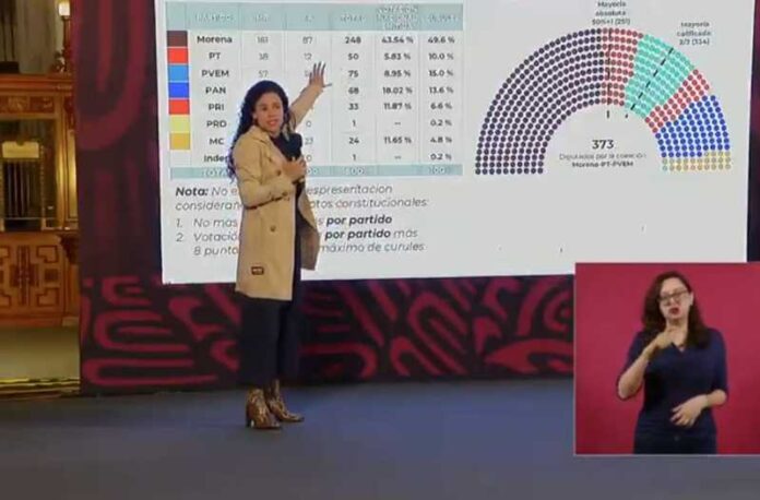 Alcalde Luján expuso el tema este día en la conferencia matutina del presidente Andrés Manuel López Obrador, donde insistió que el partido ha logrado dicha mayoría en la próxima 66 Legislatura, al darse la definición de los 200 diputados federales por la vía plurinominal, donde, por la alianza en las elecciones federales, Morena tendría 248 curules (49.6%), el Partido del Trabajo (PT) 50 (10%) y 75 (15%) el Partido Verde Ecologista de México (PVEM); lo que da una suma de 373 para esta coalición.