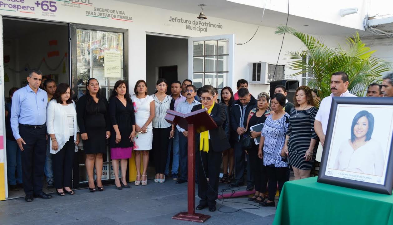 TEMIXCO, MORELOS.- Con izamiento de bandera a media asta y un minuto de aplausos el Ayuntamiento de Temixco conmemoró el primer aniversario luctuoso de la entonces alcaldesa Gisela Raquel Mota Ocampo, asesinada al interior de su domicilio la mañana del 2 de enero del 2016, un día después de haber tomado protesta.