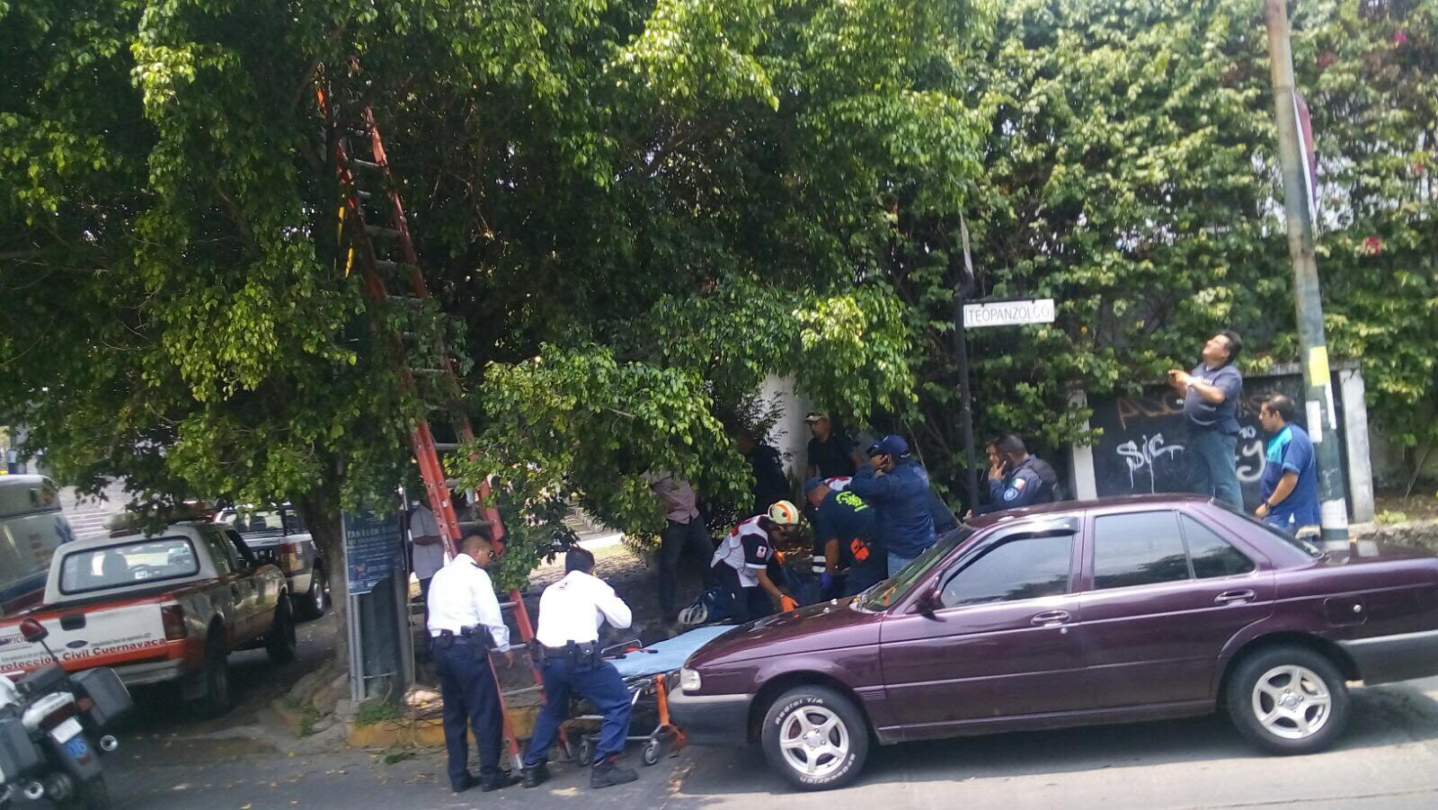 Al lugar llegaron paramédicos, bomberos y personal de Protección Civil de Cuernavaca para brindarle los primeros auxilios al lesionado, que estaba recostado e inconsciente sobre una jardinera por lo que fue estabilizado y trasladado a la clínica del IMSS de la avenida Plan de Ayala.