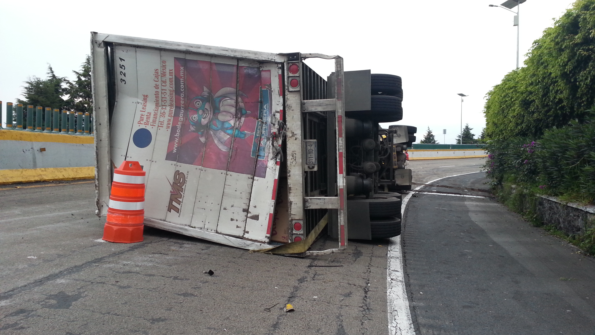 El accidente ocurrió a las 17:00 horas de este jueves en el kilómetro 66 en la curva de La Pera, donde el chófer del trailer color amarillo chocó contra el muro de contención y volcó debido al posible exceso de velocidad al que conducía.