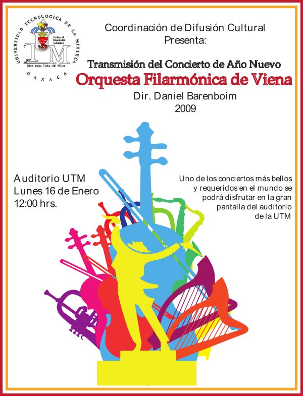 Huajuapan de León, Oaxaca, México; 13 de enero de 2017.- El próximo lunes 16 de enero a las 12:00 horas la Universidad Tecnológica de la Mixteca (UTM), transmitirá un concierto de la Orquesta Filarmónica de Viena en el Auditorio de esta casa de Estudios, con motivo del año nuevo.