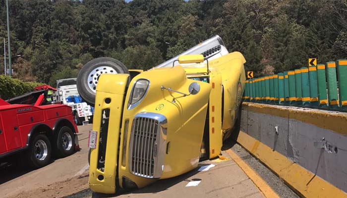 Cuernavaca, Morelos.- Un tráiler cargado con tres toneladas de fruta, volcó al medio día de este lunes en el kilómetro 67 de la autopista Del Sol, en la curva de «La Pera» del municipio de Tepoztlán.