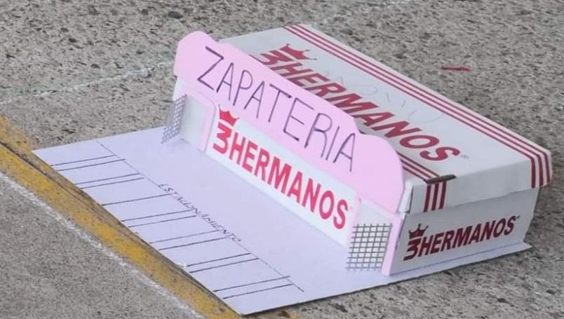 Esto, porque sólo tomó una de las cajas en las que se entrega el calzado nuevo, le agregó un letrero que decía “zapatería”, un par de puertas hechas con hojas blancas y la pegó sobre un cartón blanco al que le dibujó unos rectángulos a manera de estacionamiento.